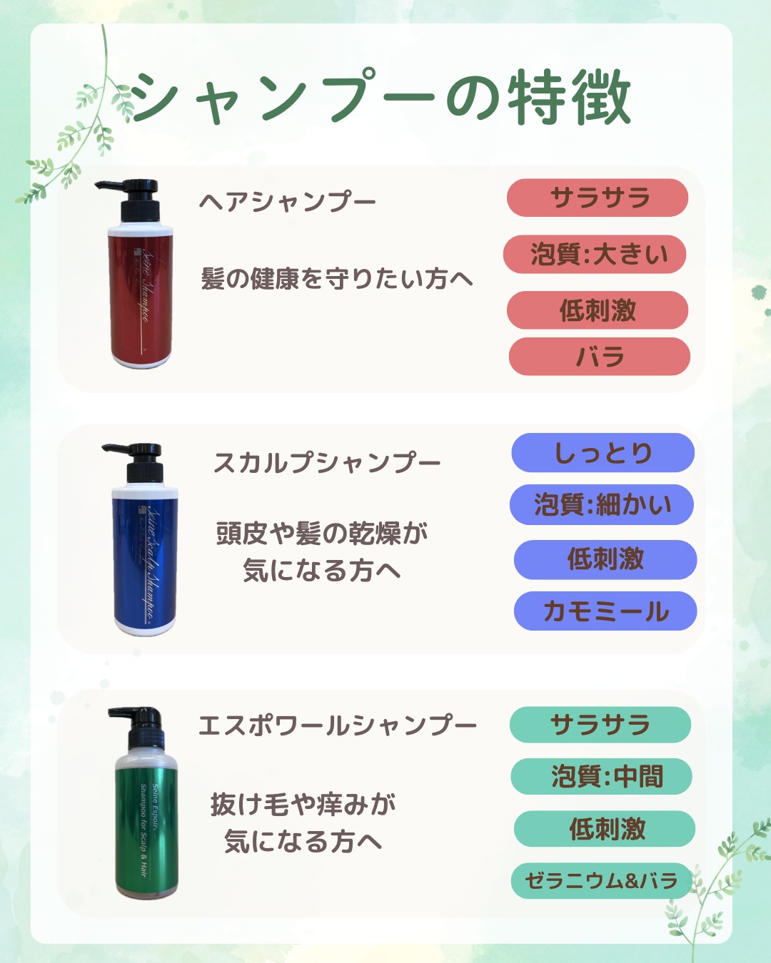 どのシャンプーもサロンで開発したもので、洗心地や香りが良いと言うだけでは無く、パーマやヘアカラーの施術によるダメージフォローも想定して開発しました。