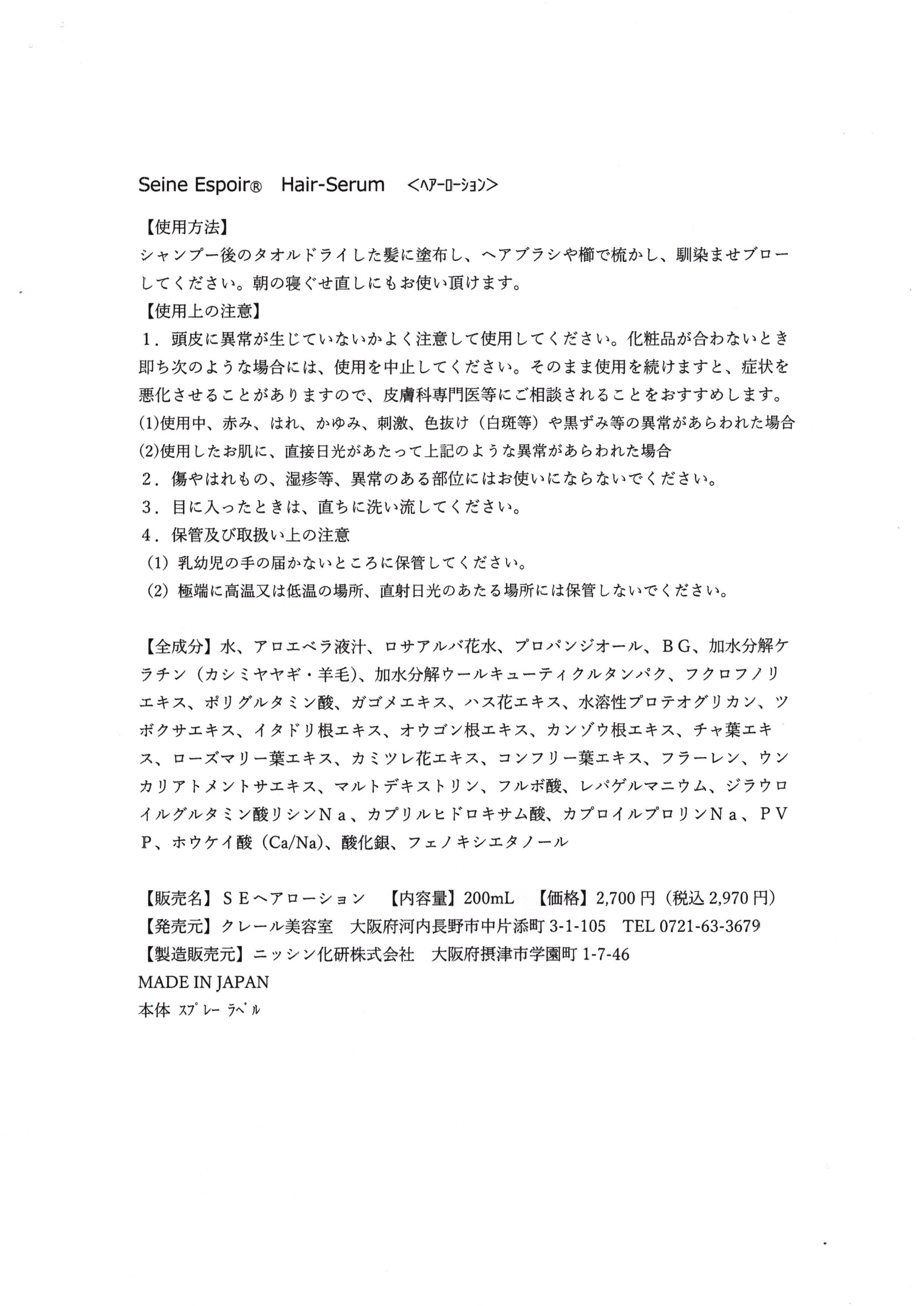 ## セーヌエスポワール・ヘアセラム(ヘアローション) トリガータイプ (200ml)